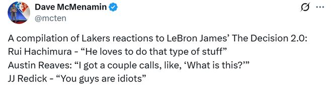 此前,詹姆斯的“決定2”引起大量關(guān)注,很多球迷以為他要宣布退役,但最終只是一條和軒尼詩合作的廣告。湖人眾將也在訓(xùn)練后被問到相關(guān)問題,前方記者匯總?cè)缦隆?/p>